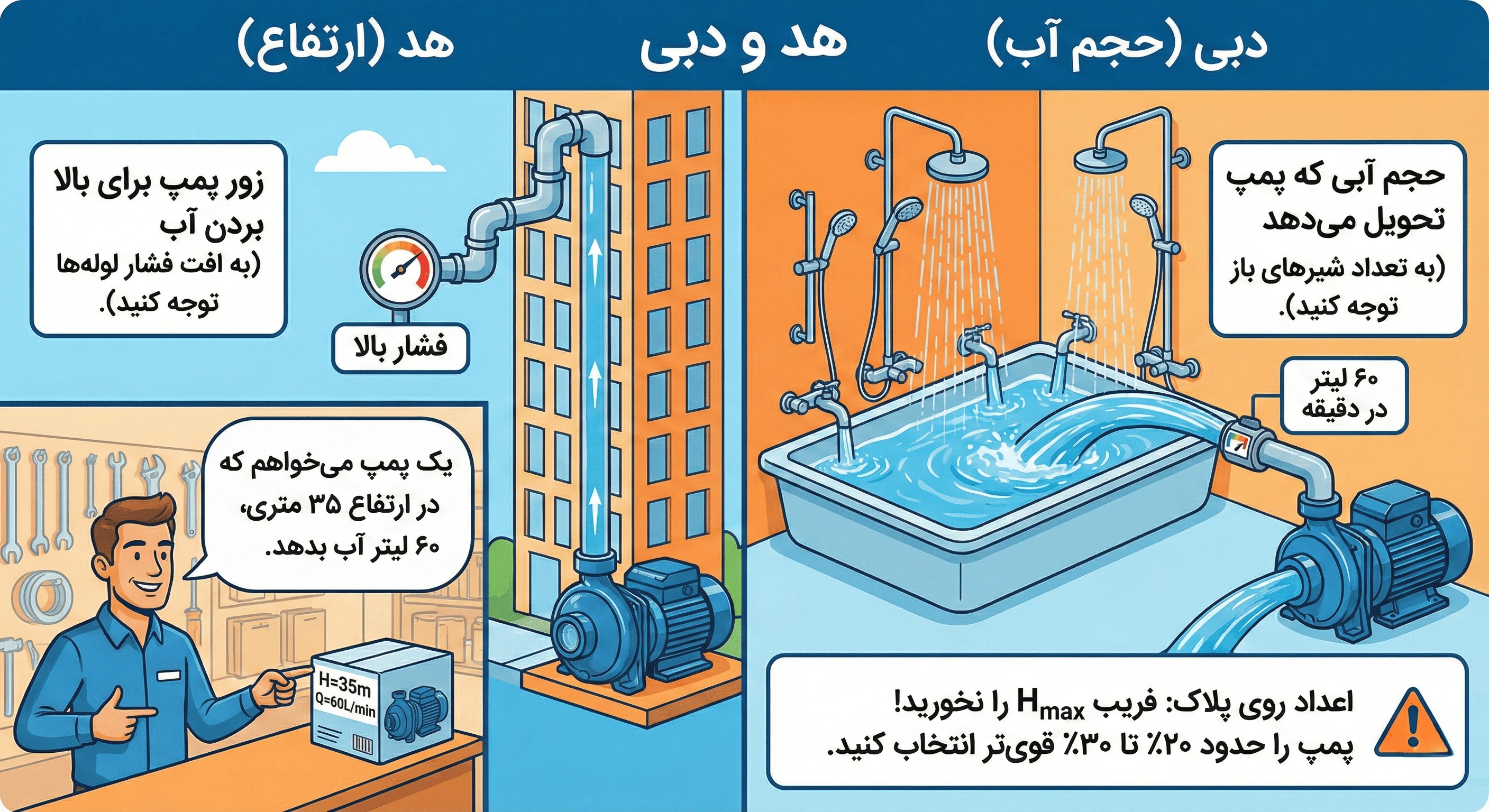 وقتی برای خرید پمپ به بازار میروید، فروشنده با افتخار به پلاک براق روی پمپ اشاره میکند و میگوید: «آقا این پمپ عالیه! ارتفاع ۶۰ متر، آبدهی ۵۰ لیتر!»شما هم با خودتان حساب میکنید: «ساختمان من ۲۰ متر است، پس این پمپ ۶۰ متری حتماً طوفان به پا میکند!»