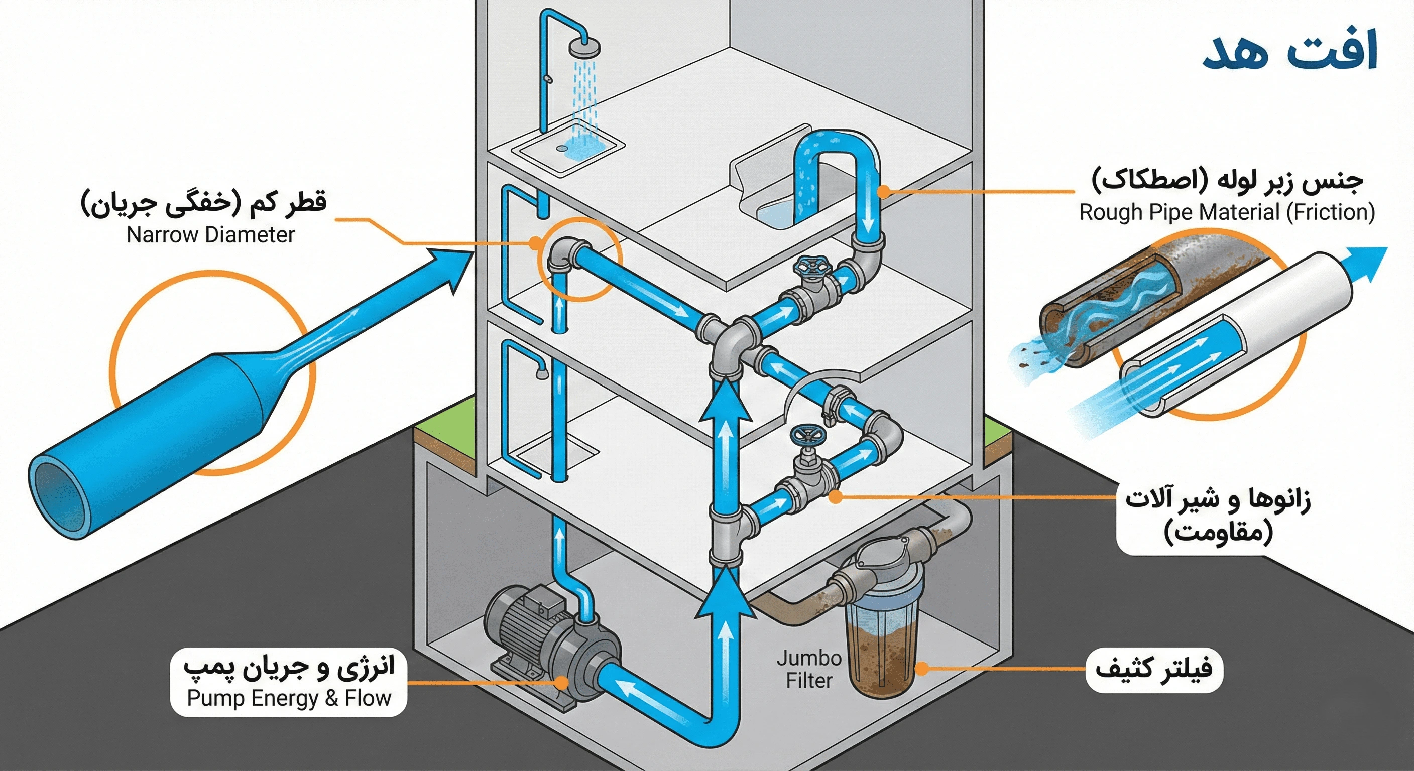 در علم مهندسی به این سارقان، «افت هد» (Head Loss) میگویند. آب برای رسیدن به شیر خانه شما، باید از مسیری پر پیچ و خم بگذرد و هر مانعی در این مسیر، بخشی از انرژی (هد) پمپ را میگیرد و میبلعد. اگر این افت را محاسبه نکنید، پمپ شما شکست میخورد.