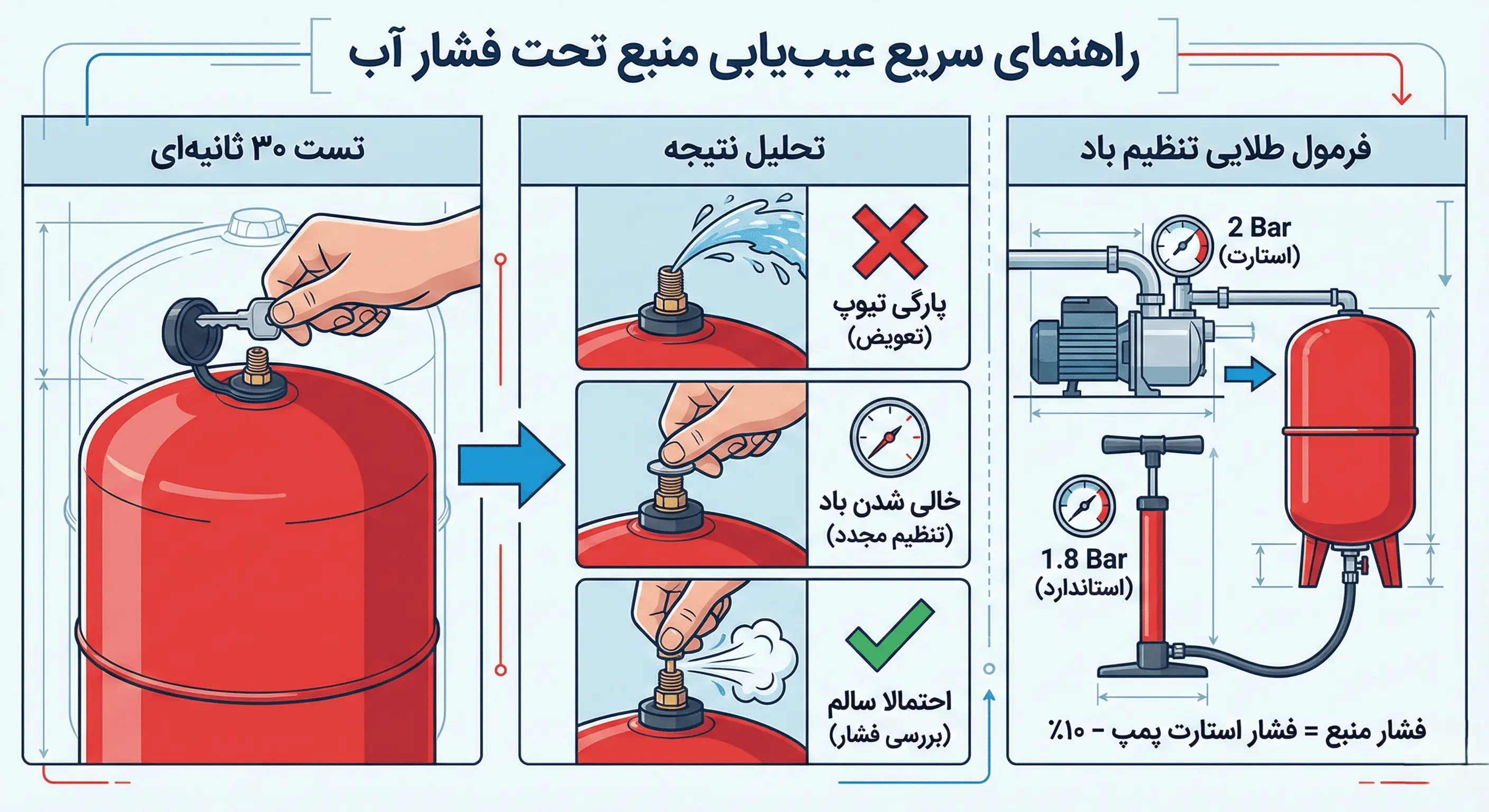 - چکاپ باد منبع (هر ۶ ماه یکبار): منتظر خراب شدن پمپ نمانید. با تغییر فصل (شروع گرما و سرما)، باد منبع را چک و تنظیم کنید.