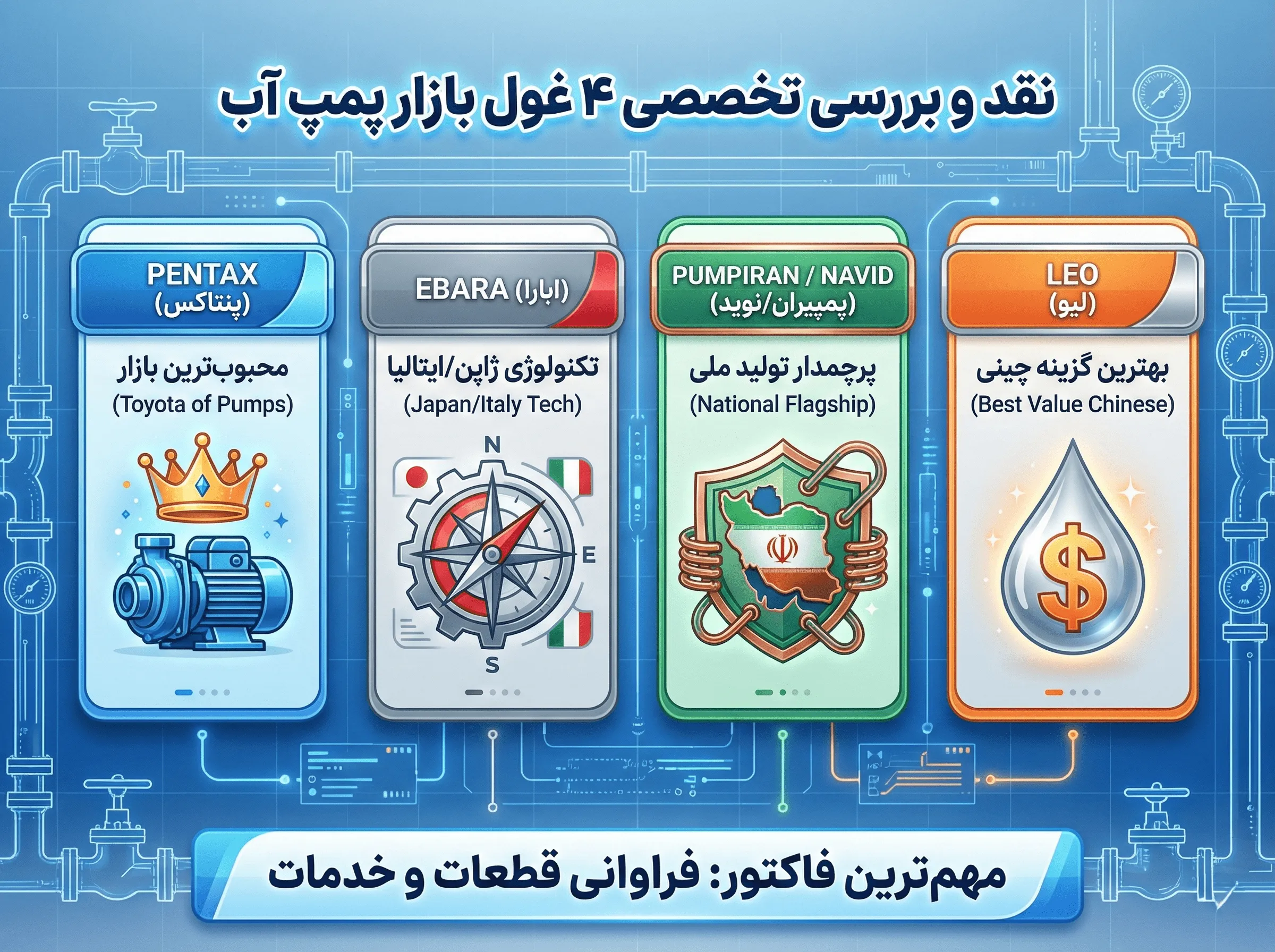 شاید بپرسید چرا فقط این ۴ برند؟ پاسخ ساده است: فراوانی قطعات و خدمات. خریدن یک پمپ عالی که قطعهاش در بازار پیدا نشود، یک اشتباه استراتژیک است. برندهای زیر ترکیبی از کیفیت مهندسی و پشتیبانی بازار هستند.
