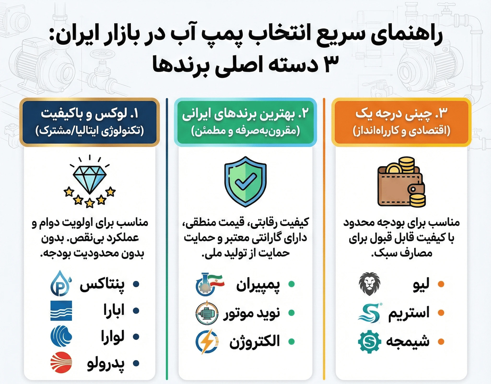 وقتی وارد بازار پمپ آب میشوید، با انبوهی از نامهای ناآشنا و قیمتهای متفاوت روبرو میشوید. برای اینکه سردرگم نشوید، بهترین راهکار این است که بازار ایران را به سه دسته اصلی تقسیم کنیم. این دستهبندی به شما کمک میکند تا بر اساس بودجه و انتظارتان از کیفیت، در زمینِ درست بازی کنید.