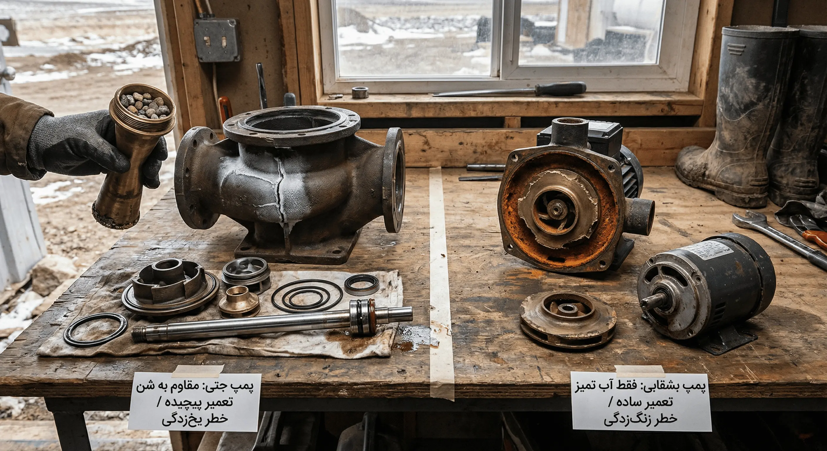 - سادگی تعمیرات (برنده: پمپ بشقابی): ساختار پمپ بشقابی بسیار ساده است (موتور + پروانه). قطعات کمتری دارد و باز و بسته کردن آن برای سرویسکار آسانتر است. استهلاک آن در صورت استفاده از آب تمیز، بسیار پایین است و سالها بدون دردسر کار میکند.