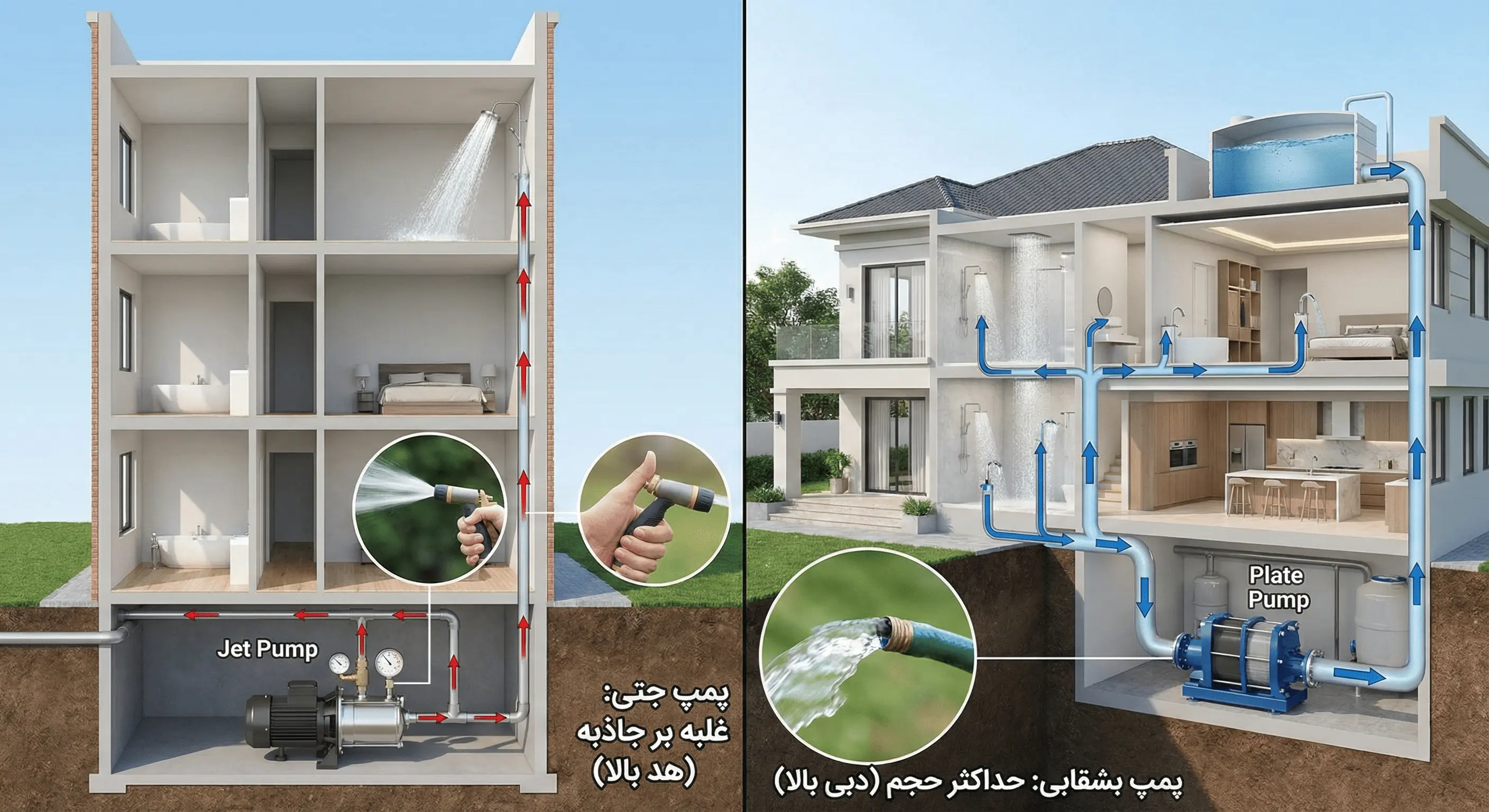 | کاربرد اصلی (پیشنهاد ما) | ساختمانهای ۴ طبقه و بالاتر، چاههای عمیق، مناطقی با قطعی مکرر آب | ساختمانهای ۱ تا ۳ طبقه، ویلاهای بزرگ، آبیاری، داخل واحد آپارتمان |